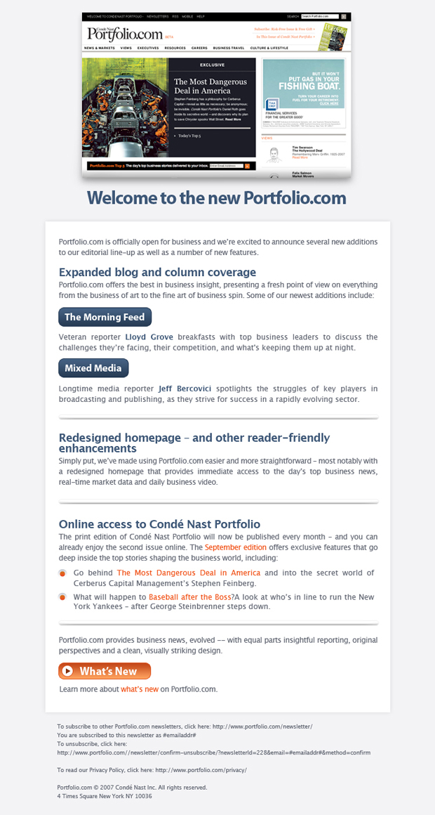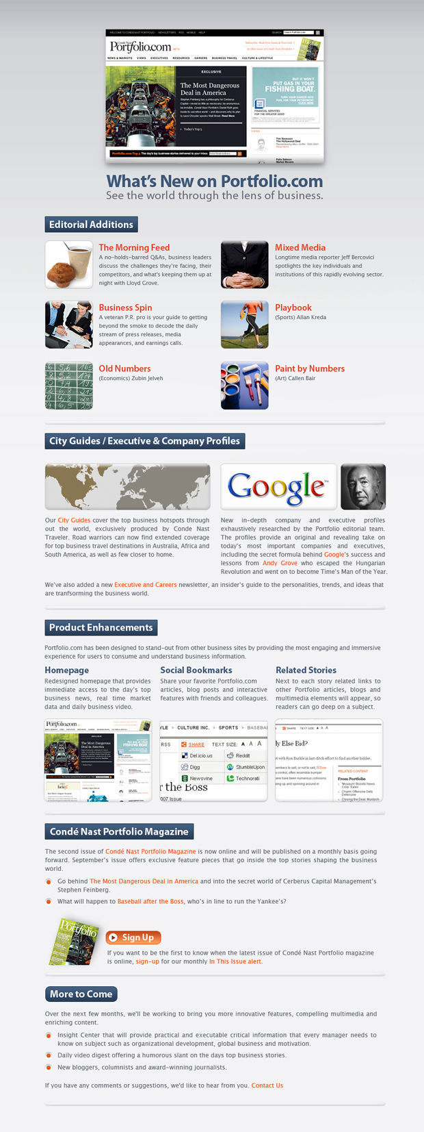 Portfolio.com was launched by Conde Nast back in 2007, featuring an impressive staff of high-profile journalists and being a serious source of business information.