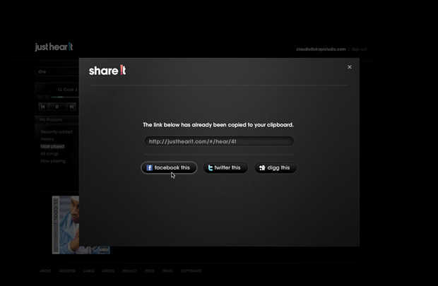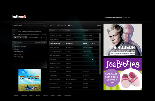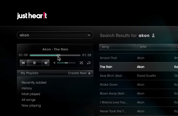 Thanks to the large number of registered users who upload their music libraries, Justhearit is able to find virtually any song, letting you store it in personal playlists or share it with friends.