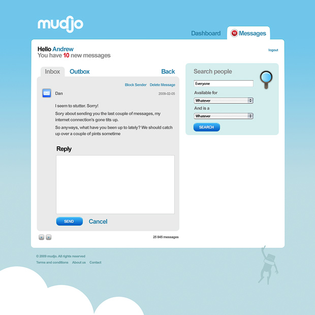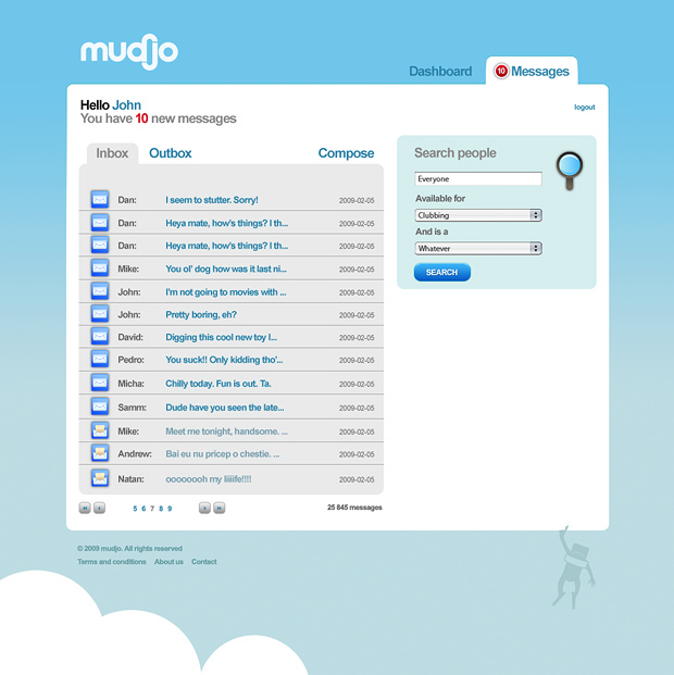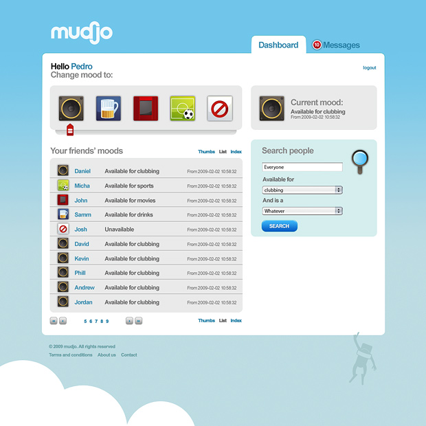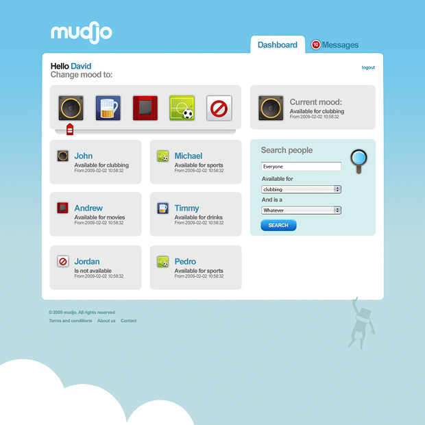 Mudjo is all about moods, not vague status updates from which no one can understand what you are up to. Besides personal and close friends updates you can also check general community moods and find new people who might share your entusiasm for a selected list of activities. We helped with usability, the graphic interface, and icons for the moods on the project.