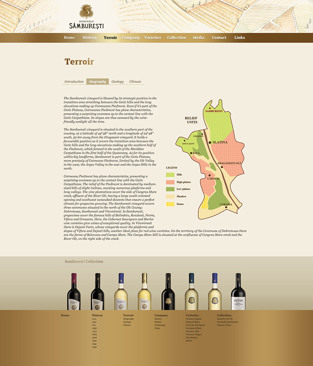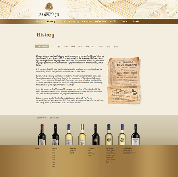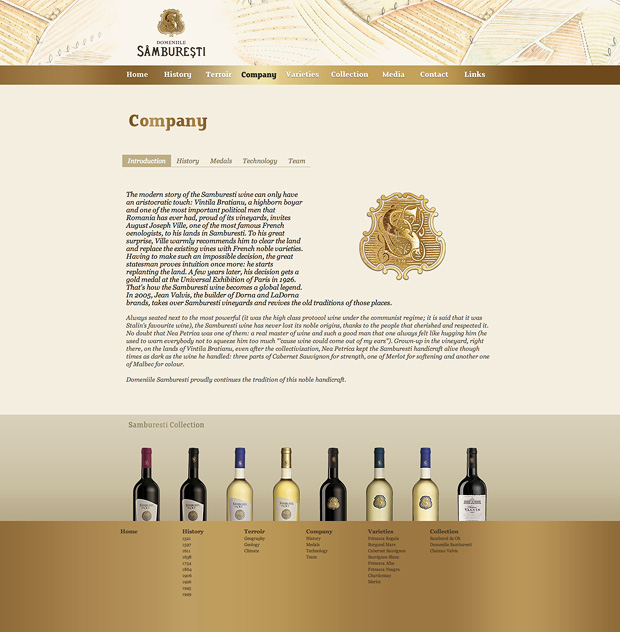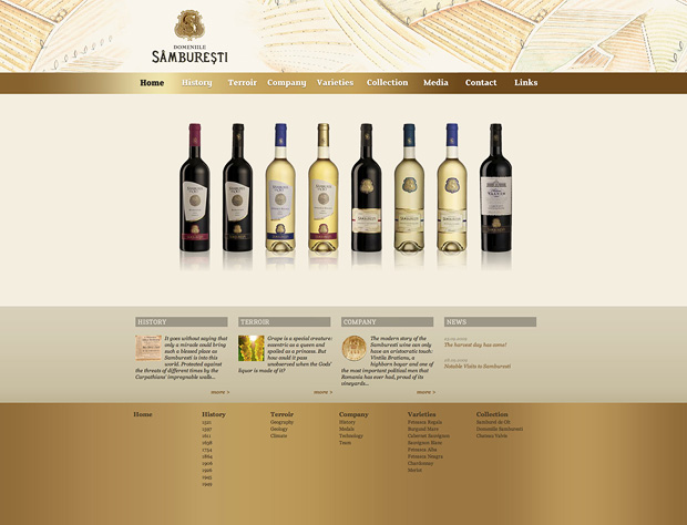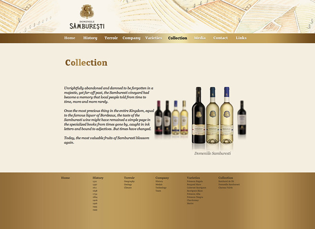 The Samburesti Website features a nice graphic presentation of the wine collection created in Adobe Flash and information on every assortment of wine available. Interested visitors can find out details about Samburesti’s long past from the history section.
