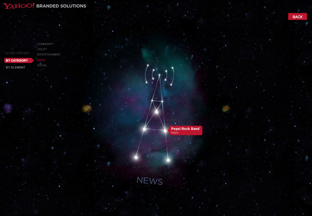 Thanks to Adobe Flash technology, we were able to create an environment where you can navigate through the galaxies or view them from multiple angles making this the ultimate Yahoo Custom Solutions experience.